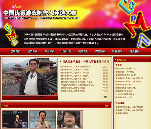 目前大会官网(http://www.chinagdc.com.cn/09cgda)正式上线,并接受参赛团队和个人的报名。目前大会官方网站所公布的内容包括:大赛的奖项设立、参赛方式、大赛首批评委名单、大赛管理规定等内容。