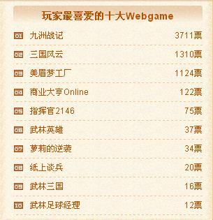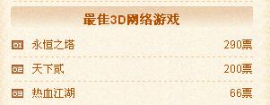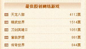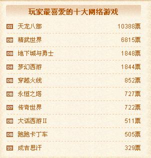 玩家最喜爱的十大网络游戏榜上,天龙八部以一万余张的高票数遥遥领先,紧随其后是精武世界,地下城与勇士,梦幻西游列三四位。争夺战已经打响,我们隐隐嗅到了硝烟的味道。最期待的网络游戏榜中,富翁梦想名列榜首。其他精彩的游戏纷纷紧随其后,给我们留下了很大的猜想空间,最期待无疑也是一个很有悬念的榜单啦。来势勇猛的天龙八部和精武世界在最佳原创榜单中也同样表现不俗,牢牢占据榜首。刀剑英雄II, 富翁梦想和传奇世界也不甘居后,票数也在迅猛增长中。最佳境外榜单中我们看到了老将地下城与勇士和新秀永恒之塔,穿越火线也很值得关注。最佳3D中永恒之塔暂列榜首。Q版中梦幻西游高票领先,精灵乐章和梦幻诛仙也蓄势待发。Webgame方面则是群雄逐鹿了,几家大型网页游戏商的作品牢牢占据榜首,竞争空前激烈。感受到了心跳的加速,感受到了空气中的紧张,持续关注吧!又一场战役将永存于历史的时空!