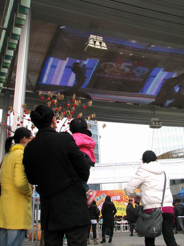 当然最令人震撼的还是在傍晚时分,国内最大的LED天幕开始滚动播放最新的动漫影视作品及本次活动精彩回顾。下午14时,舞台区上空的天幕率先试播就引起轰动,随着夜幕降临,西广场的天幕长廊也开始联动播放,从远望去宛如一条五彩巨龙遨游天际,游人纷纷驻足,抬头感受了一番“阿凡达”式的视觉盛宴!这也是国内规模最大、持续时间最长的一次“天幕动漫展映”!