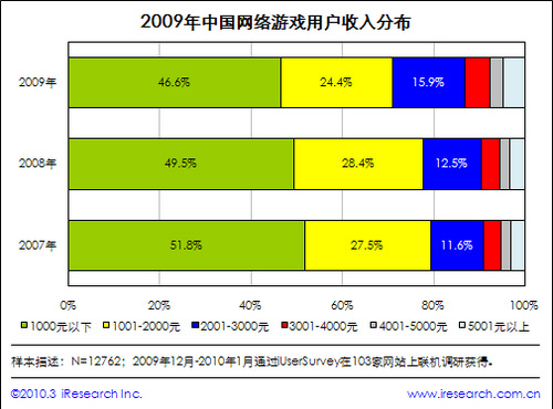 根据艾瑞咨询第九届中国网民网络消费行为大调研的数据显示,2009年中国网络游戏用户的收入结构相比前两年较大幅度提高,其中月收入1000元以内的用户由2007的51.8%下降至46.6%,1001-2000元区间的用户则下降了4个百分点,与比相反的是,月收入2001元以上的用户数量上升了9%左右。艾瑞分析认为,带动网游用户收入增长的主要原因除中国人均年可支配收入有所提高以外,固定职业用户比重上升也是重要因素,特别是近两年新增的网游用户以有稳定收入的上班族为主,这些用户不但改变了网游用户结构,也提升平均收入水平。