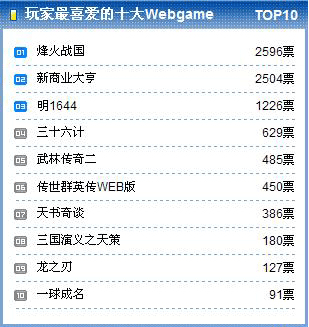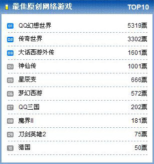 玩家最喜爱的十大网络游戏榜上,"梦幻西游"与"梦幻迪斯尼"大爆冷门,一路过关斩将,占据了前两名的位置,之前的冠军"穿越火线"位置下滑至第三名,这样戏剧化的结果在接下来的几周里很可能再度上演,最后的赢家归属依旧是个迷。最期待的网络游戏榜中,"地下城守护者世界"勇夺榜首,"星辰变"、"QQ仙侠传"紧随其后。Webgame榜单里"烽火战国"和"新商业大亨"继续他们的冠军争夺战,看来接几周的的竞争将更加激烈。最佳原创网络游戏中,"QQ幻想世界"独占鳌头,"传奇世界"屈居第二,"大话西游外传"本周也跻身三甲之列。最佳境外榜单中"地下城与勇士"、"龙之谷"、"穿越火线"三甲阵型继续保持稳定的状态,但是这样的情况也许不会持续太久。最佳3D中"龙之谷"和"QQ飞车"仪绝对的优势,夺得榜单前两名的位置。Q版网络游戏中"冒险岛"还是无人撼动的TOP1,"梦幻西游"突出重围,以微弱优势,暂时领先,紧跟其后的是"QQ炫舞"。广大热情玩家的期待,需要各大厂商的继续努力哦!