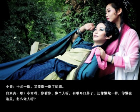 美艳成熟的白蛇,媚情顽皮的青蛇,幻化人形来到世间。昆剧的妆容,在一片郁葱丛的荷花淀更显得妩媚风情。偶遇许仙,爱意萌生,便有了之后的故事。故事从青蛇的不懂爱开始,懵懂、找寻。端午显性,书生吓破胆。接下来好似传说中那般情节,青白蛇共赴昆仑山寻求灵芝仙草以救许仙俗命。大战法海,水漫金山,白蛇产子,直到青蛇最后流下一颗名叫做“明白”的眼泪。影片没有出现文弱书生许仙特写,仿佛他的存在只是青白两个语言的道具一般。有的只是青白两人柔肠百转的心事,以及烟雨缥缈,雾霭朦胧,宛若人间仙子的一双倩影。