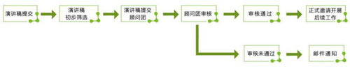 所有提交的演讲稿须经大会顾问团所有成员的匿名审议。入选大会的演讲稿须遵循大会组委会制定的三个原则和四个标准。入选演讲稿的内容摘要或节选将在大会的官方网页上刊登。