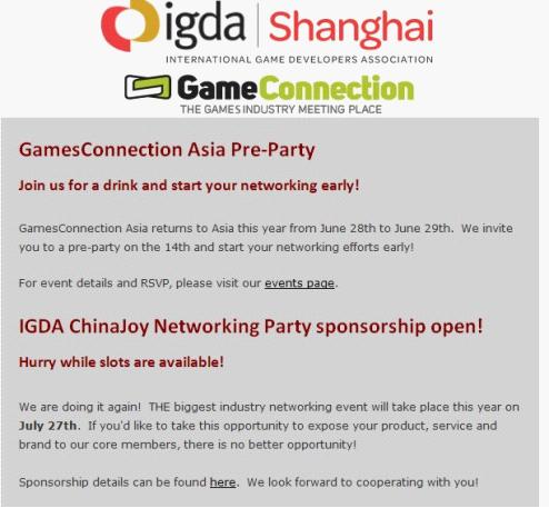 ChinaJoy组委会近日通过相关渠道获悉IGDA Shanghai Chapter正在为名为“IGDA ChinaJoy Networking Party”的活动进行市场推广并招募商业赞助。