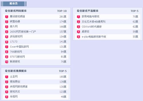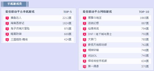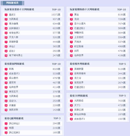 玩家最喜爱的十大网络游戏榜一直是兵家必争之地,本周榜单出现了戏剧性的变化,“画皮II”成为黑马赶超蝉联榜首数周的“九阴真经”,“剑仙情缘3”“传奇世界2”等游戏名次也有所提高。玩家最期待网络游戏榜中“黑金”坐稳前排,“龙剑”异军突起冲刺到次位。最佳境外网络游戏榜中“英雄联盟”稳扎稳打的博得本周第一的位子,而在最佳3D网络游戏榜中依旧是“九阴真经”领跑在前,后面的游戏可要再加把劲了。页游方面玩家最喜爱的网页游戏榜中“弹弹堂”“寻侠”“画皮2网页版”等游戏均展现了不俗的实力,一口气夺下了榜单的三甲,而在玩家最期待网页游戏榜中“大将军”“创世九州”等游戏也后来居上,随时有超过首位“萌三国”的可能。手游方面最佳单机游戏榜上变化不大,本周“捕鱼达人”以微弱的优势坐上榜首,最佳网络游戏榜上“博雅斗地主”一马当先,努力追赶的“逆战幻想”“仙境传说”等游戏还要再努努力了。本周金翎奖榜单变化颇大,各榜上黑马频频闪现,而本周又有哪些游戏遗憾淘汰呢,马上来公布第三轮淘汰赛被淘汰的游戏。