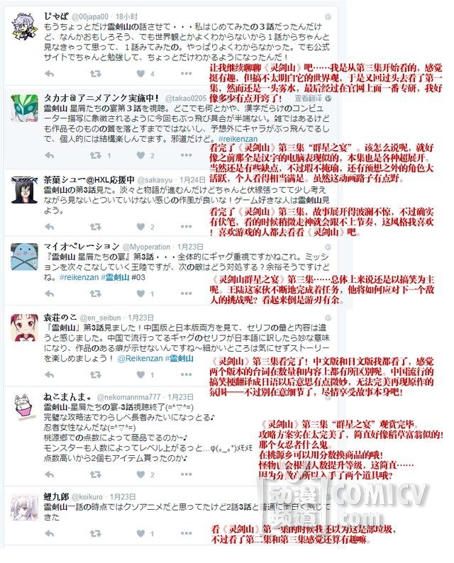 从推特的网友评论看来,大家都对第三话的各种超展开以及网游一般的“游戏规则”大呼过瘾,纷纷表示虽然略有违和感但着实新奇有趣,于是乎重新回头补前边集数的人有之,翘首企盼后续集数的人有之,吐槽王陆正太化身龙傲天的人有之……总体看来,经过三集动画狂轰滥炸般的洗礼,大多数日本观众都在第三集这个节点对于《灵剑山》表现出了莫大的热情,也不再像之前那样过于搞不清状况,能够真正享受作品本身的乐趣所在了。看到日本观众这种积极性,早就看完了小说的小编都有点不忍心告诉他们神兵利器都是浮云了……