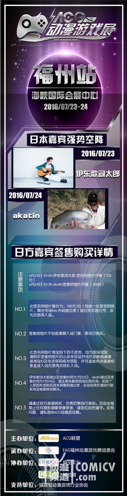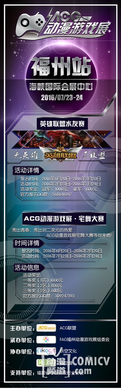 由ACG联盟主办,FAG福州动漫游戏展组委会携手轶空文化、柚动漫倾情奉献,ACG动漫游戏展,将于7月23-24日在福州海峡国际会展中心与广大动漫游戏爱好者私会两日,郎妾咸聚。当然在展会现场我们依然邀请了深受大家喜爱的二次元嘉宾与大家深入搞基~还不赶叫上你的小伙伴约过来!