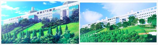 图中学校正门的这一个电梯,通向校园最核心的主干道,若不是有人物在,小编简直分不清这两张图哪张是实景,哪张是动画了。