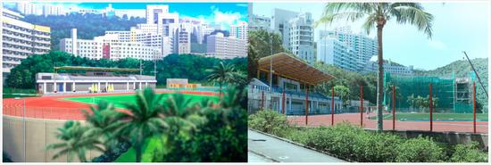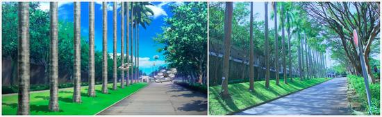 右图港科大正门前的林荫路,通往山顶校区,也是方单单和社团成员PK无人机飞行的道路,实景效果完全不逊色于动画效果。