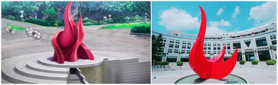 学校正门的标志雕塑,动画在原型的基础上做了一些调整,但真实的标志其实大有乾坤。仔细地看雕塑的上方,印有时间刻度,其实这是一个日晷,配合旁边的日照波动表,可以看出日晷上的阴影正好展现出小编拍摄照片的准确时间,果然,科技的细节无处不在。