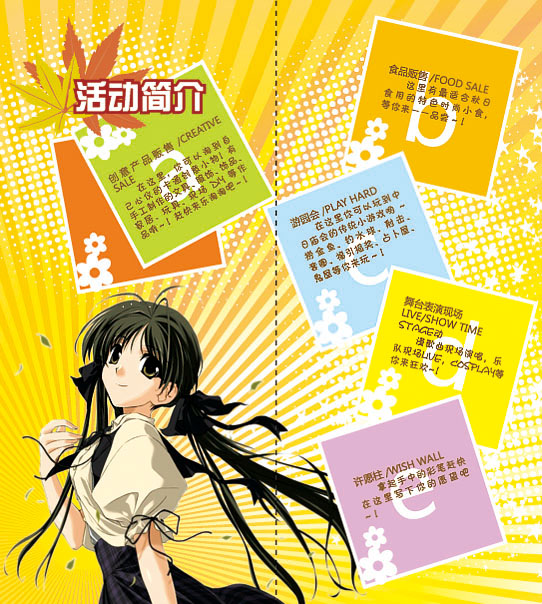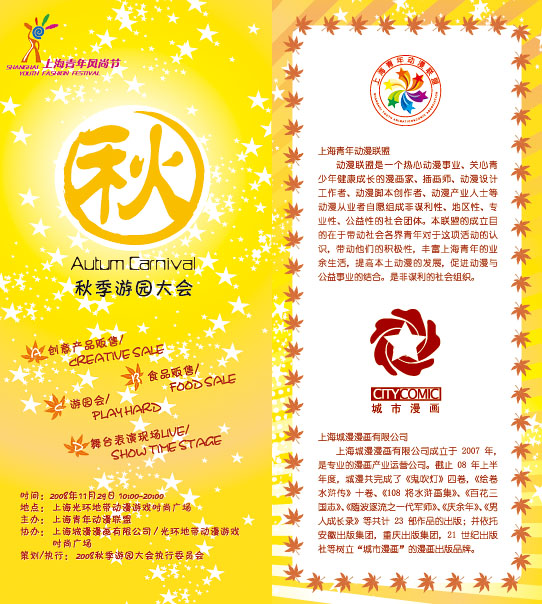 本次“2008秋季游园大会”系“上海青年风尚节”活动之一。针对人群是以日本动漫FANS为主线,向时尚创意人群以及日本文化爱好者延展的青年群体。本次活动将会有丰富多彩的游艺摊位、互动游戏等你来体验~!商场内的固有动漫游戏主题商铺也将挂起富有日式风情的红灯笼、悬铃等有趣民俗装饰,为各位游客打点出上海的“日本秋日风情街”!各位对此有爱的人们绝对不要错过了哟!